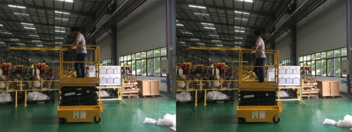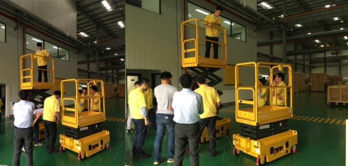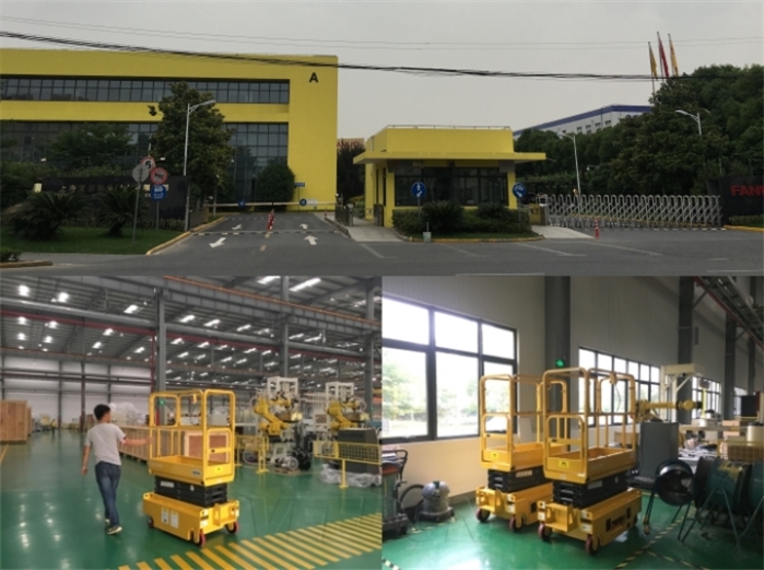 两台Veedon品牌升降作业平台在发那科机器人工厂流水线投入使用,交接及培训现场,订制FANUC 黄色