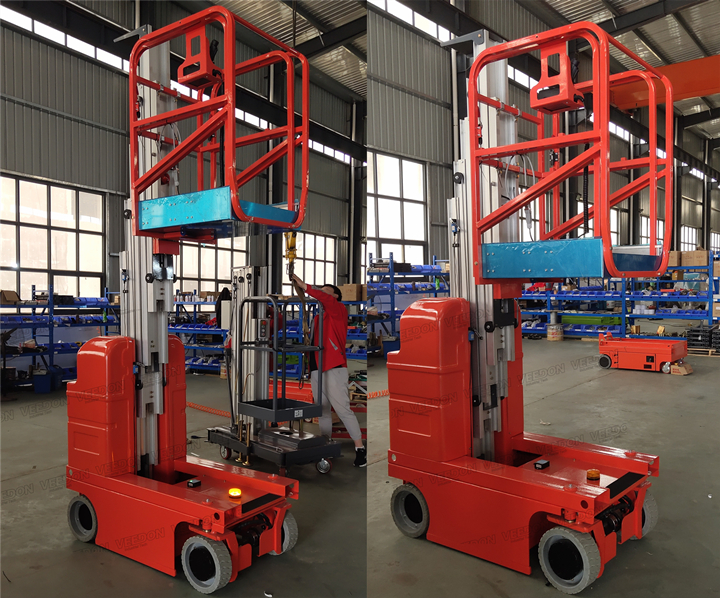 北京长征高科技项目型号VAWPM4-100W全自动桅杆式高空平台,工作高度6m,平台高度4m,载重 150kg,平台尺寸0.5×0.45m,长宽高1.2×0.76×1.98m