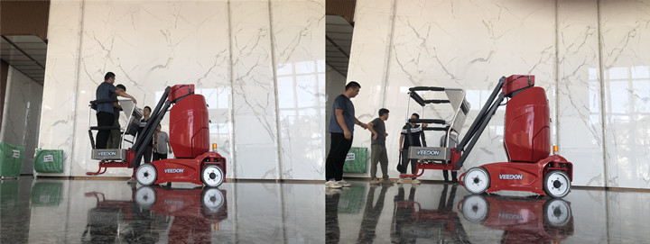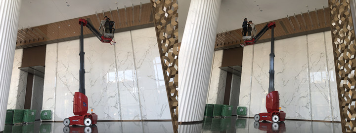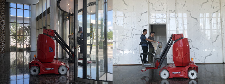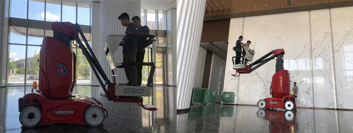 Veedon高空作业平台用于写字楼大厅日常维护检修,外立面保洁清洁,设备安装检修