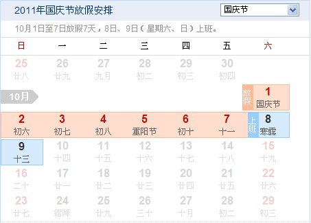 国庆节:10月1日至7日放假调休,共7天。10月8日(星期六)、10月9日(星期天)上班。