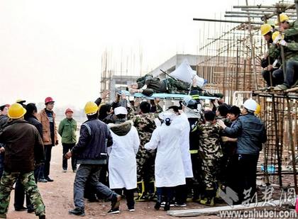 图为:受伤民工被工友和消防战士从脚手架上抬了下来