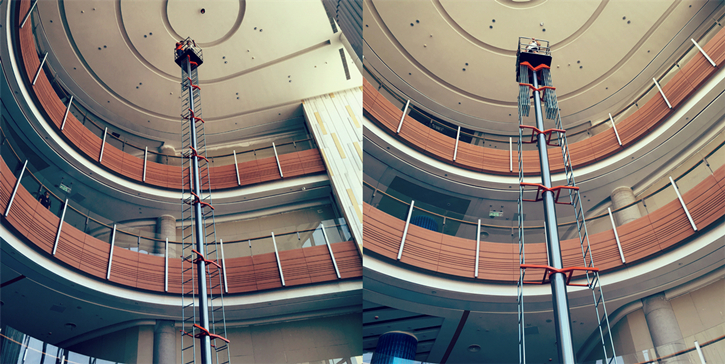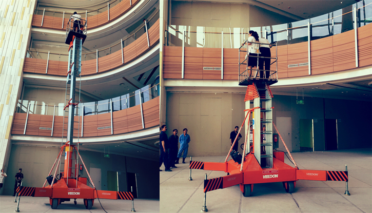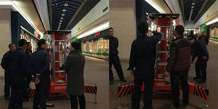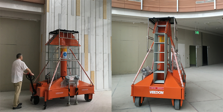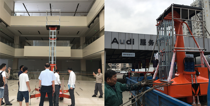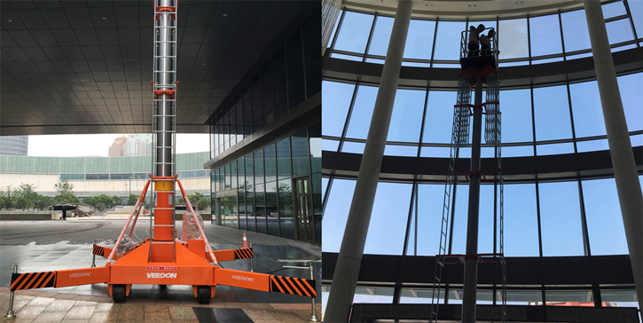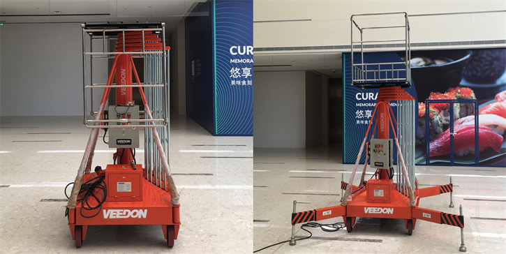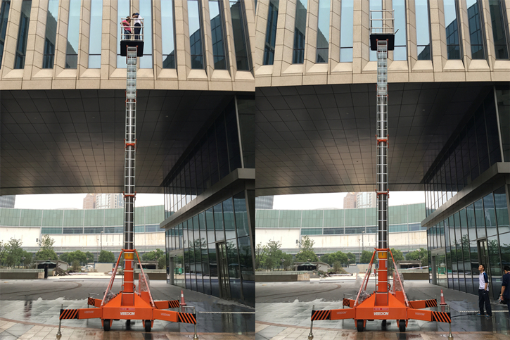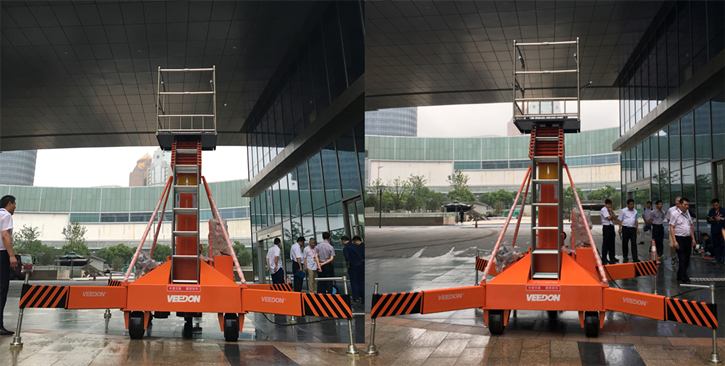 Veedon 套筒式液压高空作业升降机,简易,方便,快捷的登高作业平台登高设备。双防转式结构,双速下降系统,最大升高52米,稳定可靠,美观。为“神舟”号飞船安装对接特制平台外延伸高空作业平台登高设备。