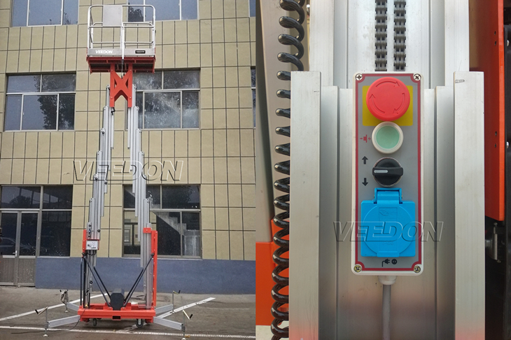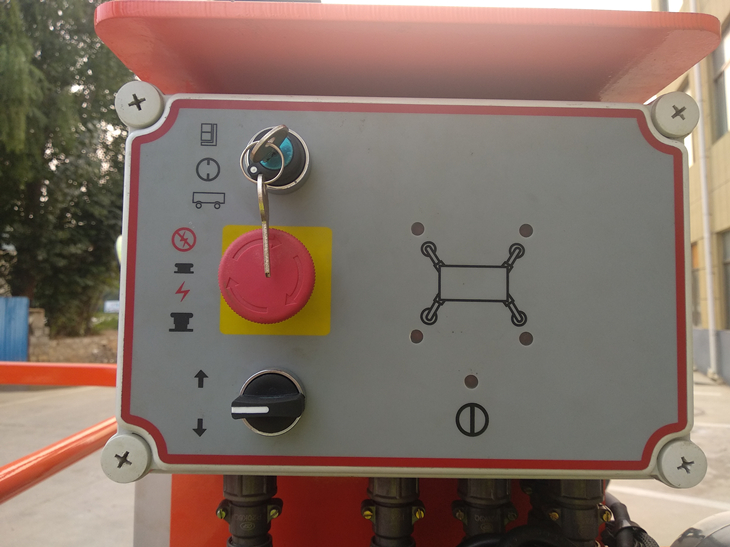 ● 控制板上有紧急停止,上升,下降和公共按钮;上升或下降时均需按住对应的按钮和“公共”键,方能启动升降。避免工人意外碰触或因误操作单键启动升降而发生意外。