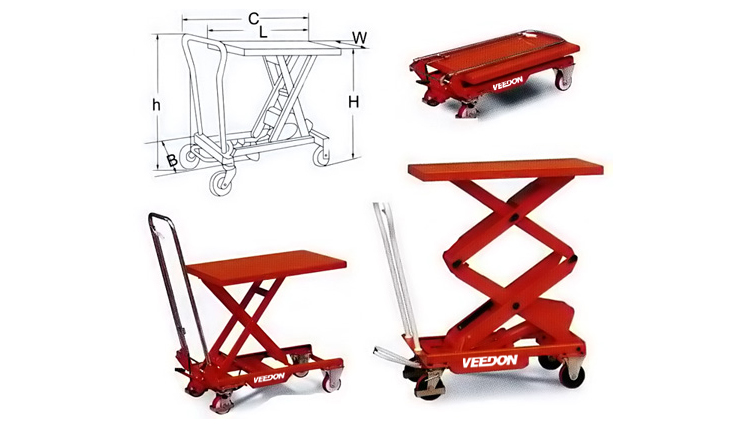 类型 | 载荷 | 台面尺寸长×宽 | 台面高度H最大/最小 | 手柄高度H | 滚轮直径 | 轮廓尺寸B×C | 脚踏开关 | 净重 |