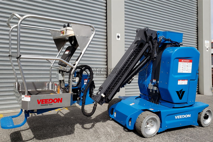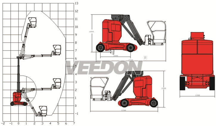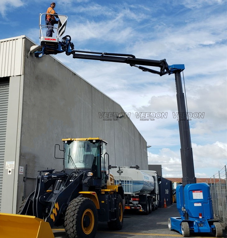 伸缩臂前端配置有摆动油缸,使平台转动范围达到±45°,明显加大用户的作业范围。