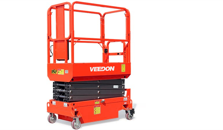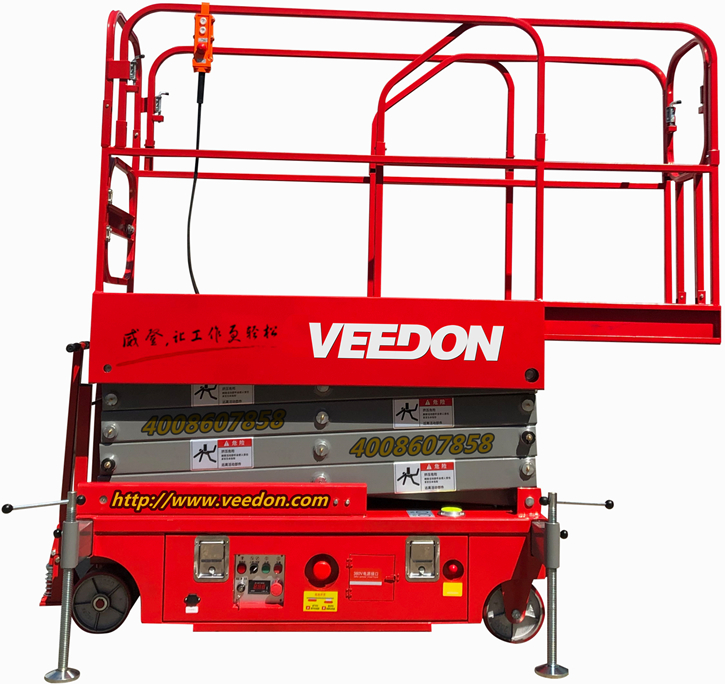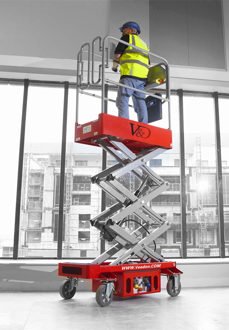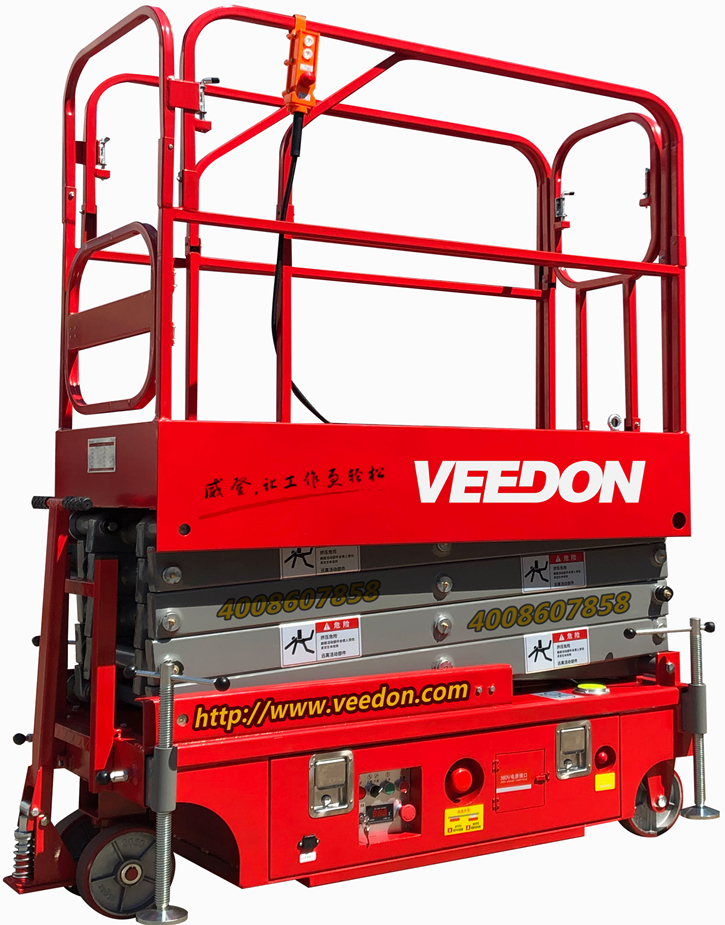 威登Veedon小型剪叉式高空作业平台质量轻、体积小单人可以轻松灵活的移动至作业点;业内最小的平台尺寸1.15m×0.70m,适合在狭小的空间作业;抽屉式底盘方便维护;故障代码自动显示方便检修。