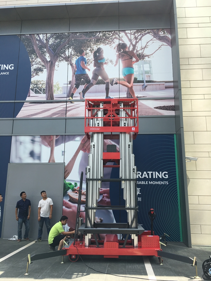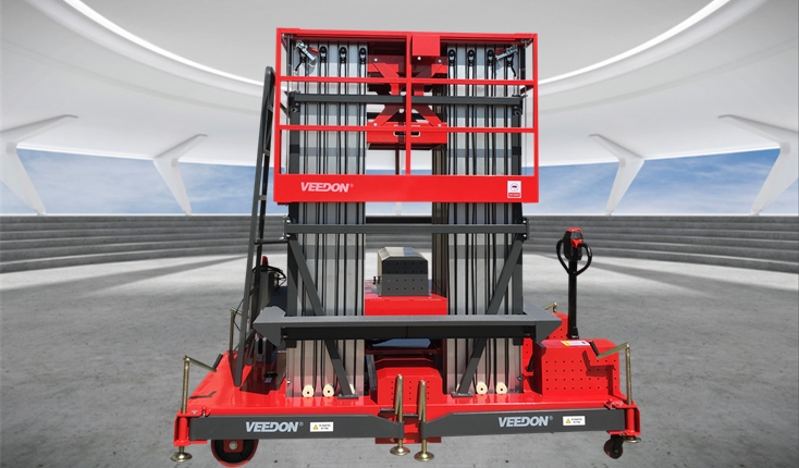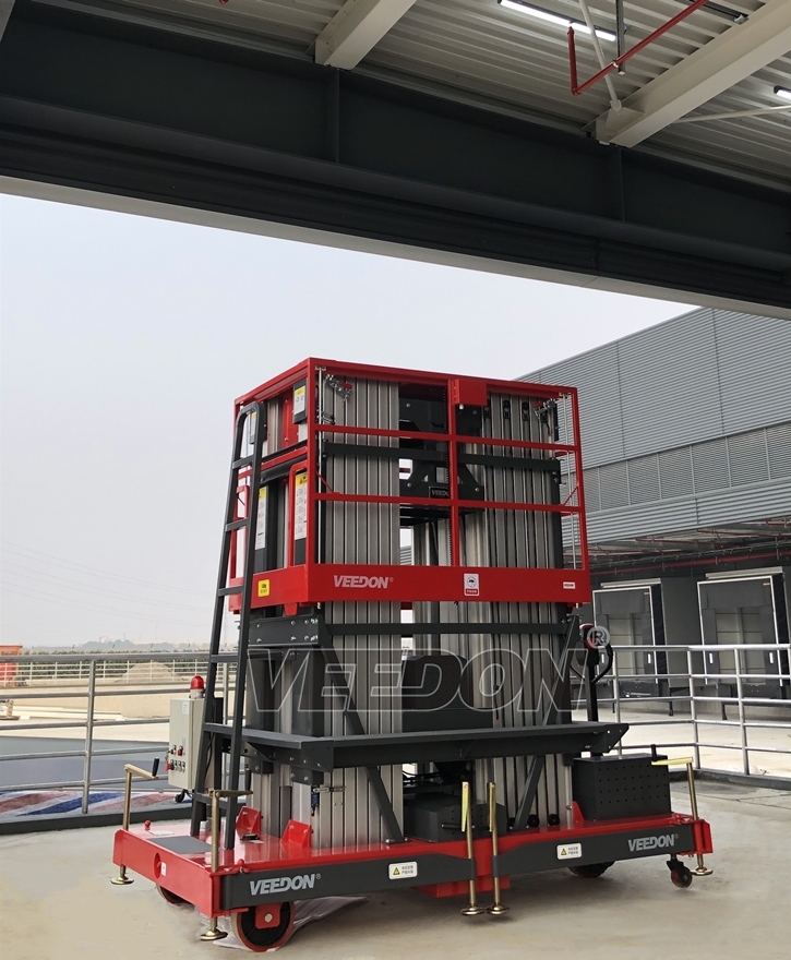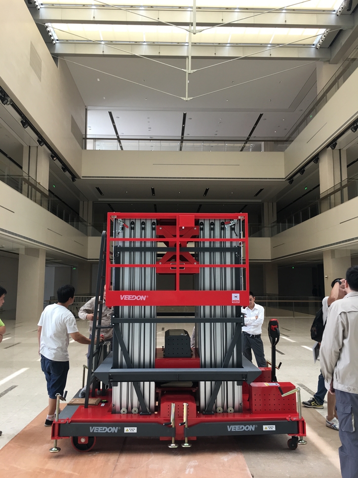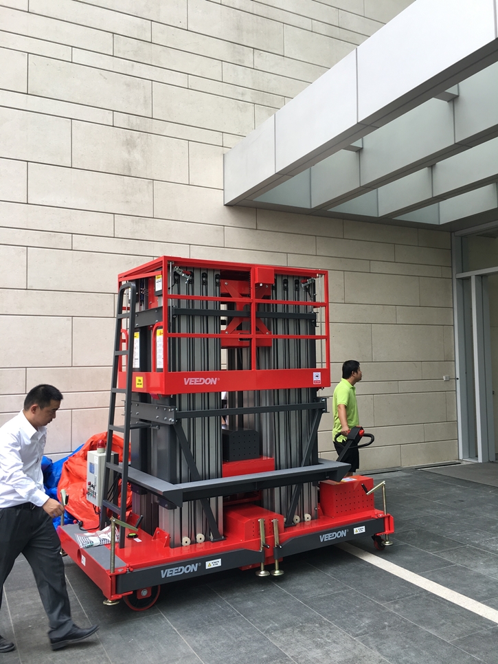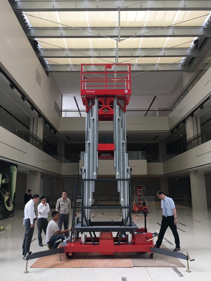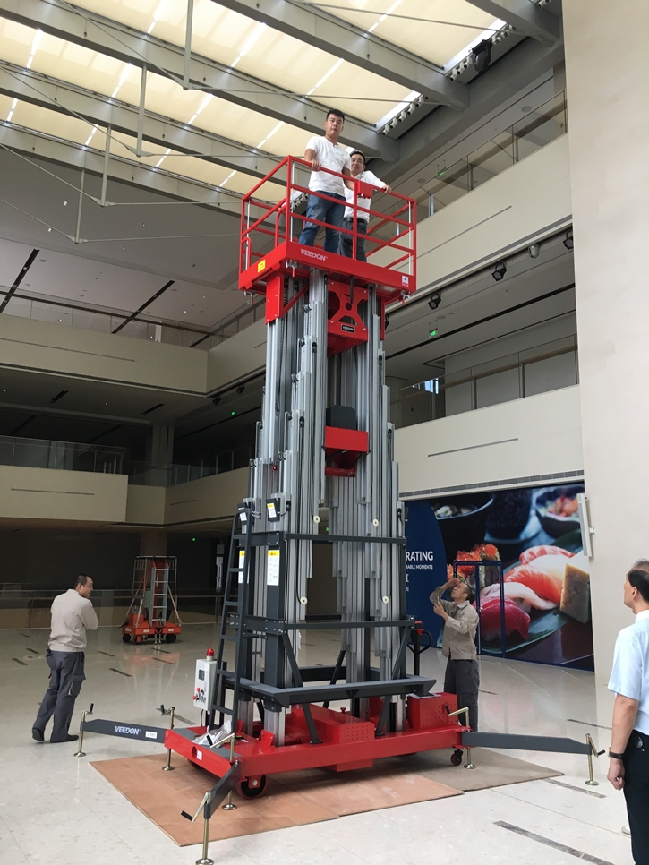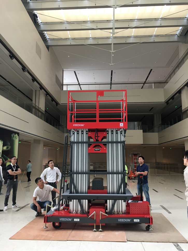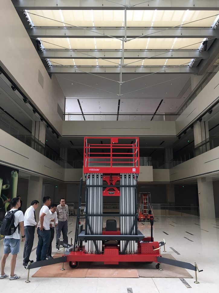Veedon桅杆式高空作业升降平台采用铝合金材质机身,整机轻巧,方便移动、运输,工作平台上下方均安装操作按钮及应急停止按钮,轻盈的结构,精致的机身,适用于酒店、商场、礼堂、会场、议事厅、工业工厂等中高端场所,多桅柱分为三桅、四桅和六桅,分别因其而设计,为了满足客户对设备高度和作业稳定性的要求而设计,轻盈的外观设计能在极小的空间范围内发挥最高的举升能力